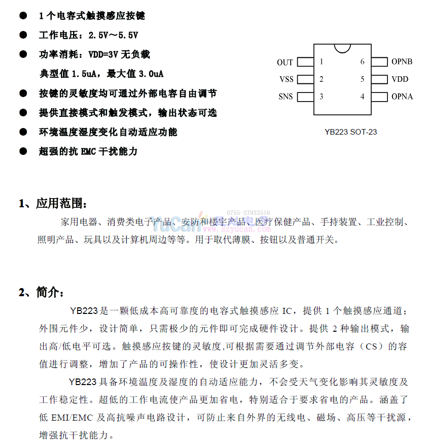 YB223/YB233系列 主要應(yīng)用產(chǎn)品領(lǐng)域: 感應(yīng)出液器,小家電,感應(yīng)觸摸面板,音箱,臺燈,