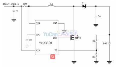 當(dāng)接通輸入電源時,YB53300進(jìn)入充電狀態(tài),控制片外N溝道 MOSFET導(dǎo)通,電感電流上升,當(dāng)上升到外部電流檢測電阻設(shè)置的上限時,片外N溝道MOSFET截止,電感電流下降,電感中的能量轉(zhuǎn)移到電池中。當(dāng)電感電流下降到外部電流檢測電阻設(shè)置的下限時,片外N溝道 MOSFET再次導(dǎo)通,如此循環(huán)。電池電壓通過電阻分壓網(wǎng)絡(luò)反饋到FB管腳,當(dāng)FB管腳電壓達(dá)到1.205V(典型值)時,充電過程結(jié)束,片外N溝道 MOSFET保持截止?fàn)顟B(tài)。當(dāng)FB管腳電壓下降到再充電閾值時,YB53300再次進(jìn)入充電狀態(tài).YB53300最高工作頻率可達(dá)MHz,工作溫度范圍從-40℃到+85℃